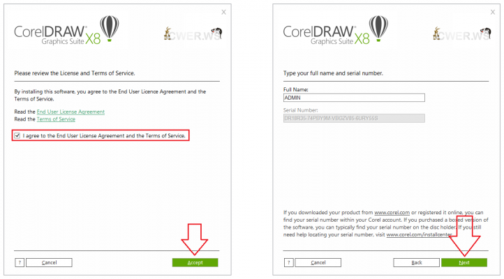 Bước 1: Chạy file CorelLauncher.exe trong thư mục cài đặt. Sau đó tích Iagree to the End User… như hình dưới. Sau đó chọn Accept