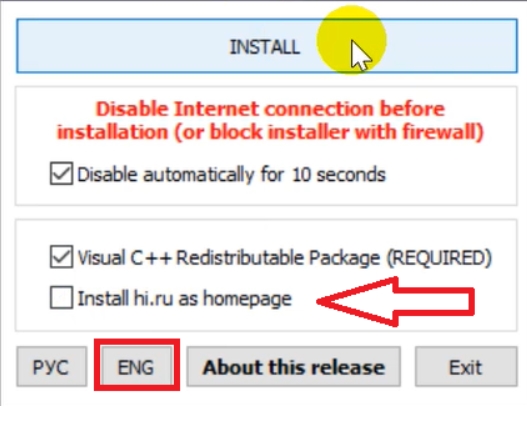 Tiếp theo thì chọn ENG để chuyển sang ngôn ngữ tiếng Anh nha. Và bạn bỏ dấu check ở tùy chọn thứ hai như hình bên dưới và tiếp theo bấm Install nhé.